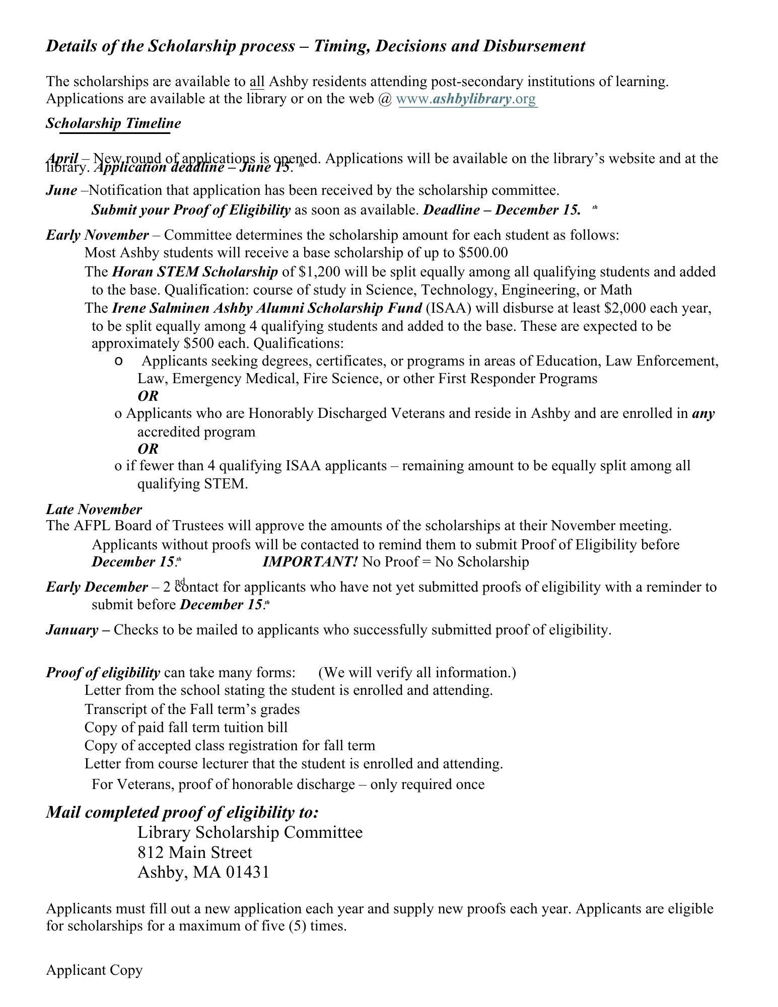 The scholarship application , along with a detailed explanation of the process is provided at the links to the right, and at the library. Once you have completed your application, you may submit it in person to a librarian or email it to the Library Trustees at ashbyfreepubliclibrarytrustees@gmail.com.